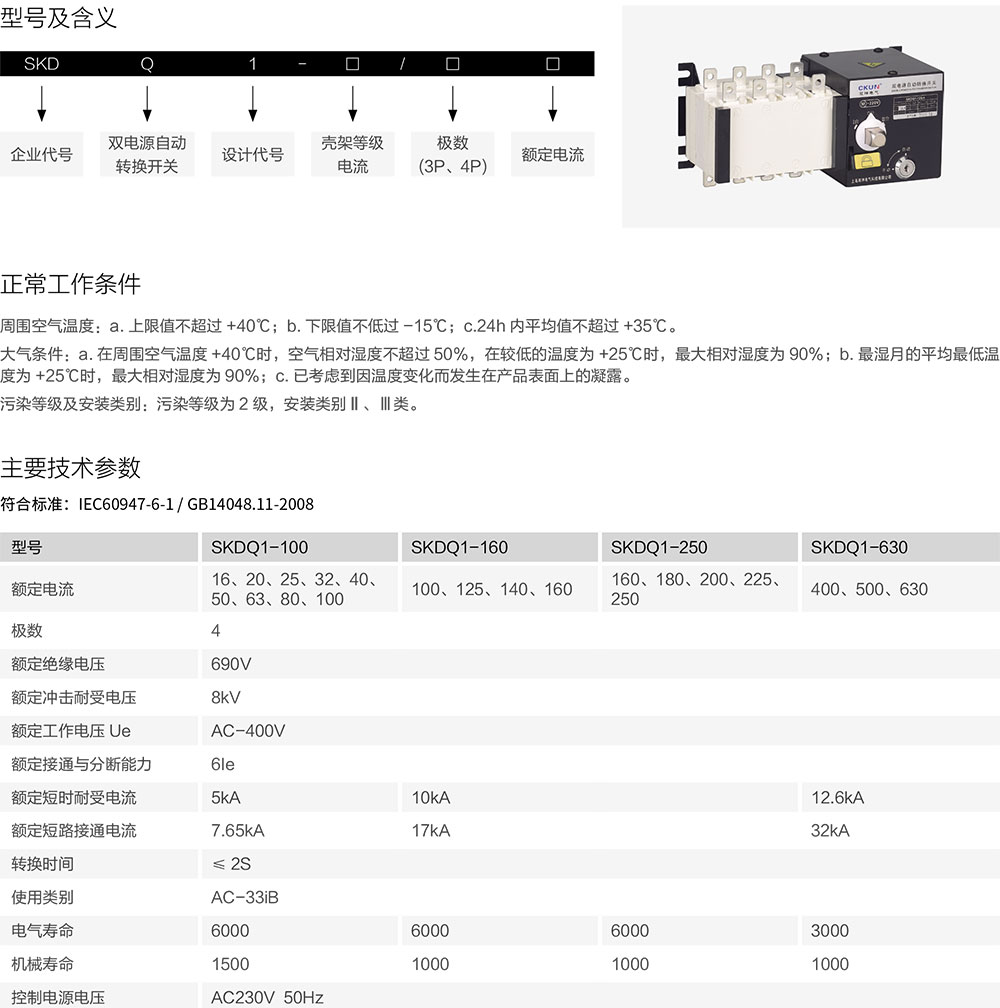 SKDQ1(PC 级)系列隔离型双电源自动转换开关,是集开关与逻辑控制于一体,真正实现机电一体化的自动转换开关,具有电压检测、频率检测、通讯接口、电气、机械互锁等功能,可实现自动、电动远程、紧急手动控制。