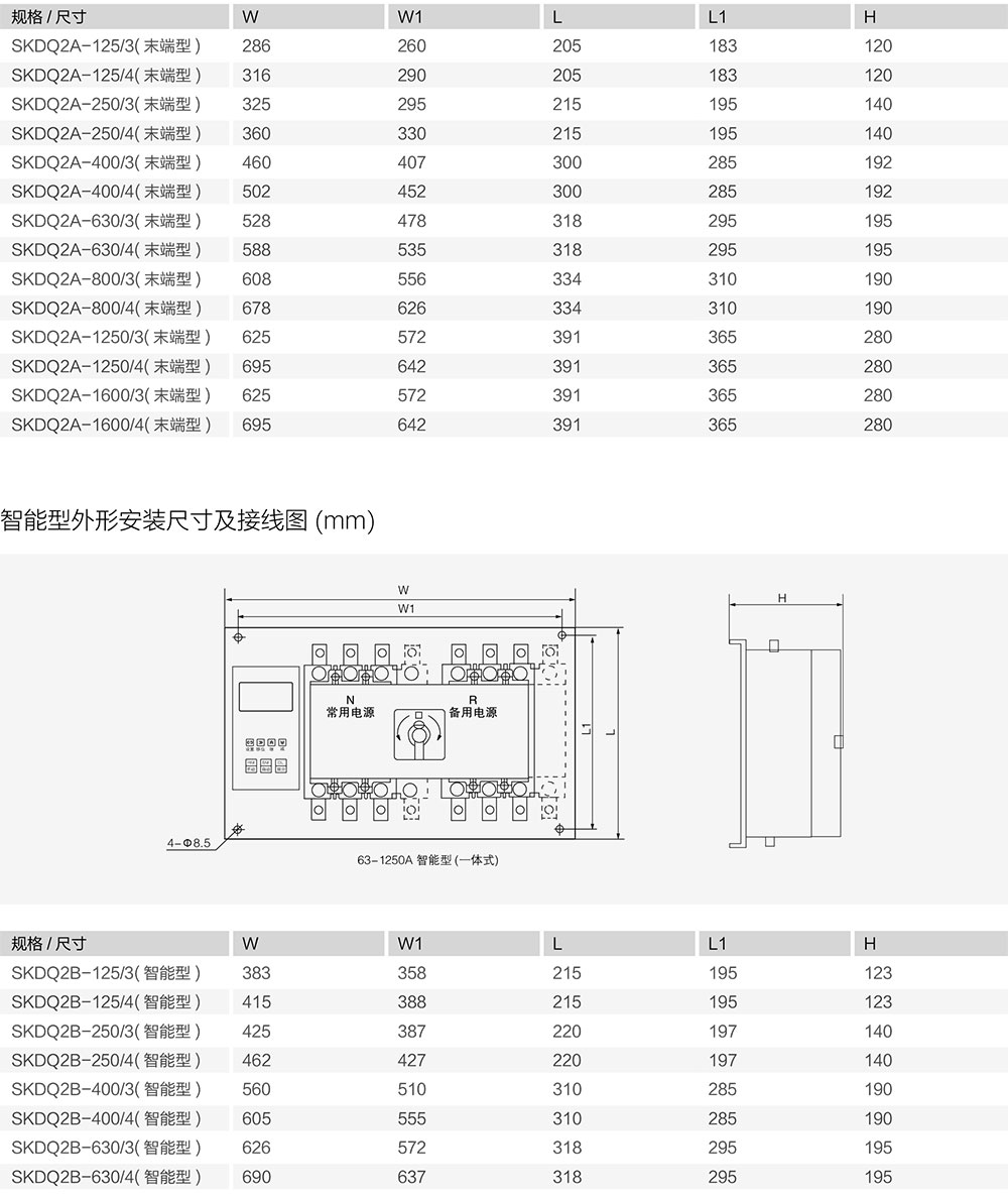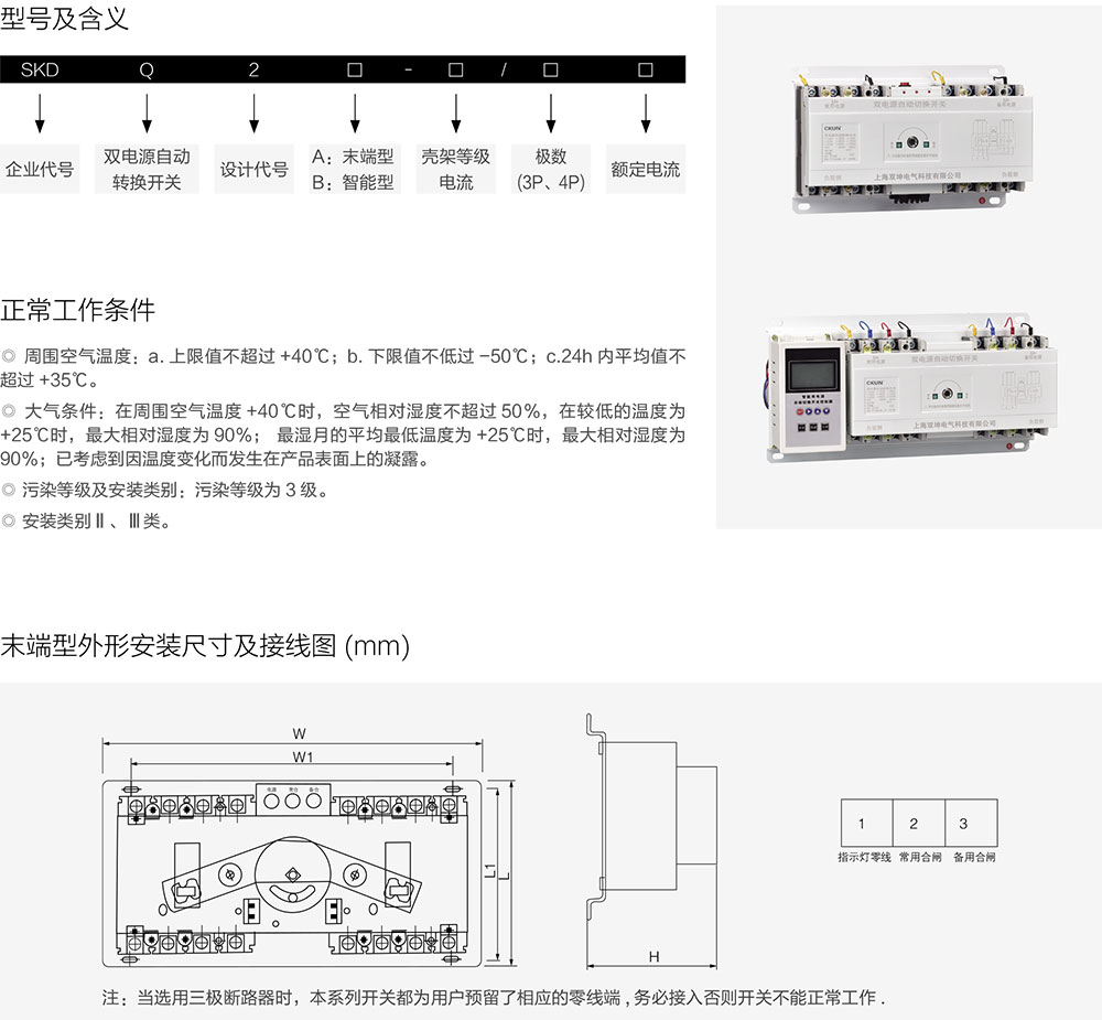 SKDQ2(CB级)系列双电源自动转换开关适用于50Hz,额定工作电压400V,额定电流16A-1600A的末端型双回路供电系统。可以完成常用电源与备用电源之间的自动转换,以保证供电的可靠性。主要用于高层建筑、商场等消防泵、消烟风机、电梯、生活水泵、事故照明、集散标志等场所。