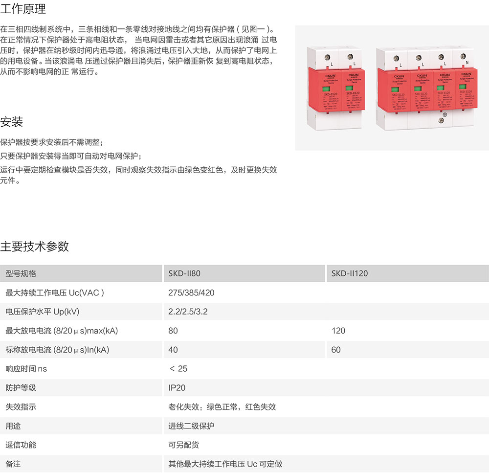 SKD-II80/II120系列电涌保护器(以下简称SPD)适用于低压交流配电系统的IT、TT、TN-C、TN-S、TN-C-S,等供电系统,对间接雷电和直接雷电影响或其他瞬时过电压的电涌进行保护。依据IEC61643-1:1998-02标准的第Ⅱ级电涌保护器。B类电涌保护器SPD具有共模(MC)和差模(MD)保护方式。